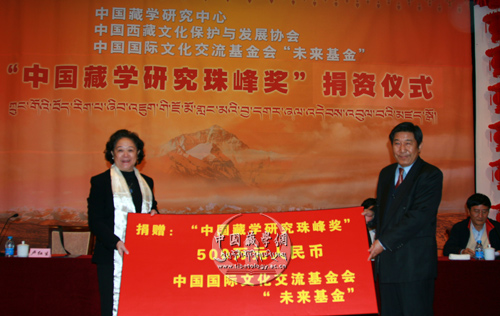 中國藏學(xué)研究珠峰獎是經(jīng)中央政府批準(zhǔn)設(shè)立的我國藏學(xué)研究領(lǐng)域的國家級獎項(xiàng),旨在促進(jìn)中國藏學(xué)事業(yè)進(jìn)一步發(fā)展繁榮。首屆中國藏學(xué)研究珠峰獎于2005年4月啟動,2006年5月圓滿結(jié)束,評獎活動在社會引起廣泛關(guān)注和良好反響。第二屆中國藏學(xué)研究珠峰獎已于2009年7月啟動。中國國際文化交流基金會“未來基金”本著弘揚(yáng)中華文化,鼓勵多出藏學(xué)研究精品,促進(jìn)中國藏學(xué)事業(yè)進(jìn)一步發(fā)展繁榮的宗旨,決定對由中國藏學(xué)研究中心和中國西藏文化保護(hù)與發(fā)展協(xié)會共同主辦的“中國藏學(xué)研究珠峰獎”進(jìn)行資助,提供自第二屆至第六屆共五屆珠峰獎獲獎項(xiàng)目的獎金。