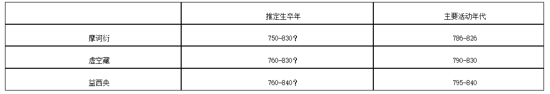由上表可以看出,這三位有師徒關(guān)系的禪宗師幾乎就是同齡人,他們主要的活動(dòng)年代實(shí)際上是重疊的,主要集中在8世紀(jì)后期至9世紀(jì)前中期,也就是說(shuō),在780-830年間,三位杰出的禪師是在并肩作戰(zhàn),他們雖然以師徒的關(guān)系出現(xiàn),但年齡相仿,主要活動(dòng)年代基本相同,其結(jié)果是禪宗在他們的共同努力下得到很大的發(fā)展。摩訶衍的主要功績(jī)?cè)谟谒麑h地禪宗傳入吐蕃,并且是在相當(dāng)困難的條件下;虛空藏則是將漢地禪宗吐蕃化的關(guān)鍵一環(huán),他早期協(xié)助摩訶衍在吐蕃傳教,后期則創(chuàng)建大瑜伽派——藏地的禪宗派系,也是第一位用藏文著書立說(shuō)的禪師;益西央在譯經(jīng)、整理經(jīng)典以及綜合性理論建樹上都做出了貢獻(xiàn),他大量在吐蕃邊地組織摩崖造像、祈愿文的鐫刻活動(dòng),對(duì)這些地方佛教文化的發(fā)展做出了積極的努力。