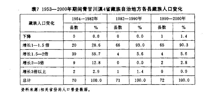 從人口絕對數(shù)字來看,藏族人口在大多數(shù)地區(qū)都在持續(xù)增長。但是藏族人口在各縣總?cè)丝谥兴急壤诓煌貐^(qū)有不同的變化。