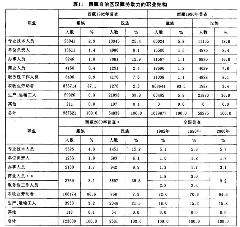 五、西藏自治區(qū)漢藏人口的職業(yè)結(jié)構(gòu)