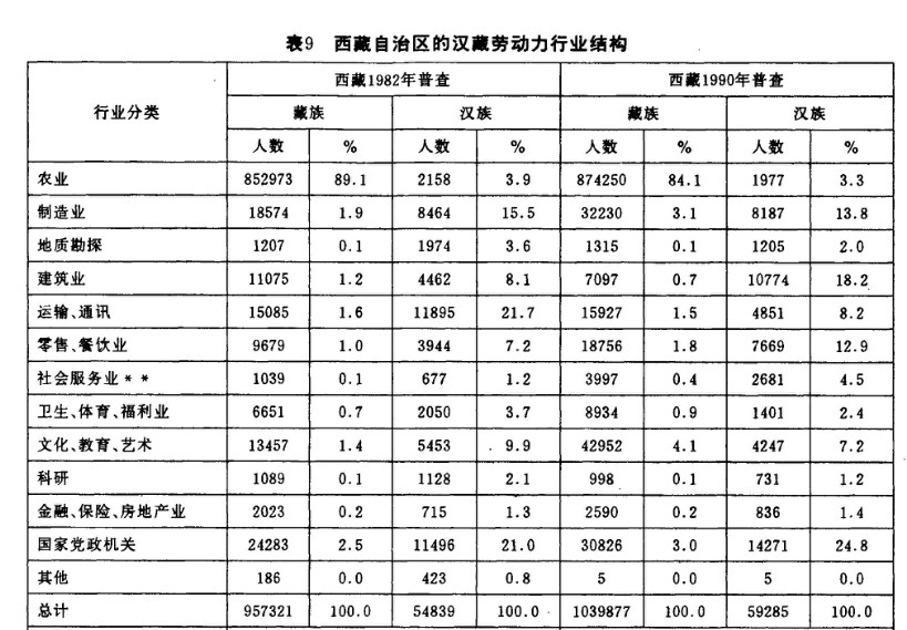 分析一個人口集團的經(jīng)濟發(fā)展狀況,人口學家和經(jīng)濟學家通常會關(guān)注其在業(yè)人口的行業(yè)結(jié)構(gòu)和職業(yè)結(jié)構(gòu)。行業(yè)按生產(chǎn)部門劃分為:農(nóng)牧業(yè)、工業(yè)、建筑業(yè)、商業(yè)等等。行業(yè)結(jié)構(gòu)(即產(chǎn)業(yè)結(jié)構(gòu))反映了各產(chǎn)業(yè)的規(guī)模和勞動力在產(chǎn)業(yè)部門之間的轉(zhuǎn)移情況,表現(xiàn)了一個地區(qū)經(jīng)濟發(fā)展的總體水平和各族群在經(jīng)濟結(jié)構(gòu)中所占據(jù)的相對位置。各次人口普查都有勞動力行業(yè)的信息,表9為1982年、1990年和2000年這3次普查所反映的西藏自治區(qū)漢族、藏族勞動力行業(yè)結(jié)構(gòu)。