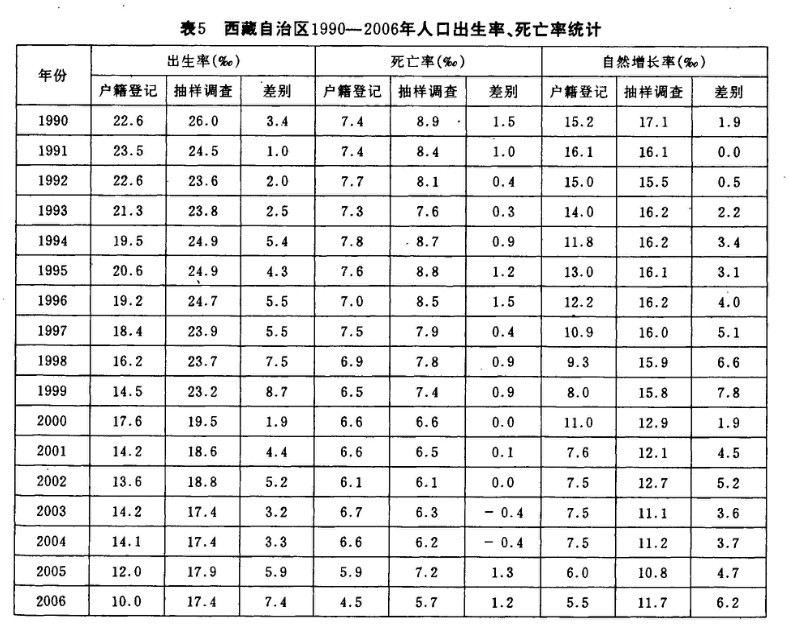 如何解釋戶籍統(tǒng)計與抽樣調(diào)查數(shù)據(jù)的差距,需進一步的調(diào)查分析。一個可能性是隨著西藏自治區(qū)經(jīng)濟的發(fā)展和區(qū)域間經(jīng)濟交流的加強,西藏自治區(qū)內(nèi)各地區(qū)的人口在數(shù)量增長的同時,加強了在西藏自治區(qū)內(nèi)部的地域流動性。因此有可能有一些“常住人口”(很可能是遷居其他地區(qū)期間所出生的子女,他們應當被統(tǒng)計為西藏自治區(qū)的“常住人口”)被當?shù)貞艏块T的統(tǒng)計所遺漏,但在人口抽樣調(diào)查時被登記。