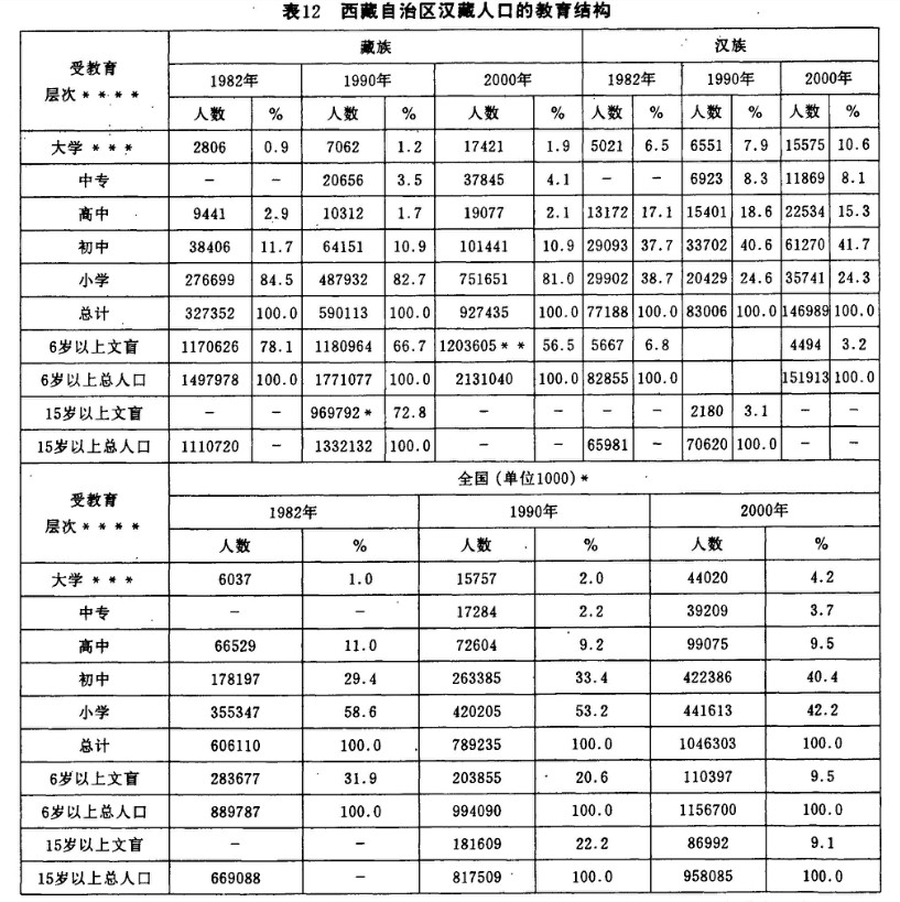 “教育結(jié)構(gòu)”指的是一定年齡以上(有的統(tǒng)計標準是6歲,有的是12歲或15歲)人口中受各種程度教育的人的百分比。在我國的教育統(tǒng)計和人口普查中,受教育的程度一般稱為“文化程度”。表12是西藏自治區(qū)人口的受教育狀況及結(jié)構(gòu),數(shù)據(jù)來自3次人口普查,表中還提供了全國的相應數(shù)字以便與西藏自治區(qū)的數(shù)字作比較。