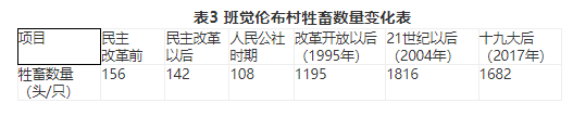 班覺倫布村牲畜數(shù)量的變化可見表3。與內(nèi)地農(nóng)村的小農(nóng)經(jīng)濟不同,西藏農(nóng)村的經(jīng)濟結(jié)構(gòu)是農(nóng)牧結(jié)合,在農(nóng)業(yè)保障生存的基礎(chǔ)上,牧業(yè)直接關(guān)系著西藏農(nóng)民生活水平的提高。根據(jù)表3,可以看出不同時期班覺倫布村牲畜數(shù)量的變化。民主改革前,為了著重保證農(nóng)業(yè)生產(chǎn),班覺倫布村的許多草地被墾成農(nóng)田使用,直接制約了畜牧業(yè)的發(fā)展與牲畜數(shù)量的增加,而且封建農(nóng)奴制更是確保絕大多數(shù)的牲畜屬于領(lǐng)主,朗生幾乎不可能擁有牲畜。民主改革與人民公社時期,牲畜總數(shù)量保持相對穩(wěn)定,但使用的種類與功能發(fā)生了一定變化。[8]改革開放以來,班覺倫布村牲畜數(shù)量呈十倍以上的增長速度,畜牧業(yè)的迅速發(fā)展反映出人民生活質(zhì)量的迅猛提高,牲畜不僅是食物來源和燃料來源,更是交通工具與創(chuàng)收方式。