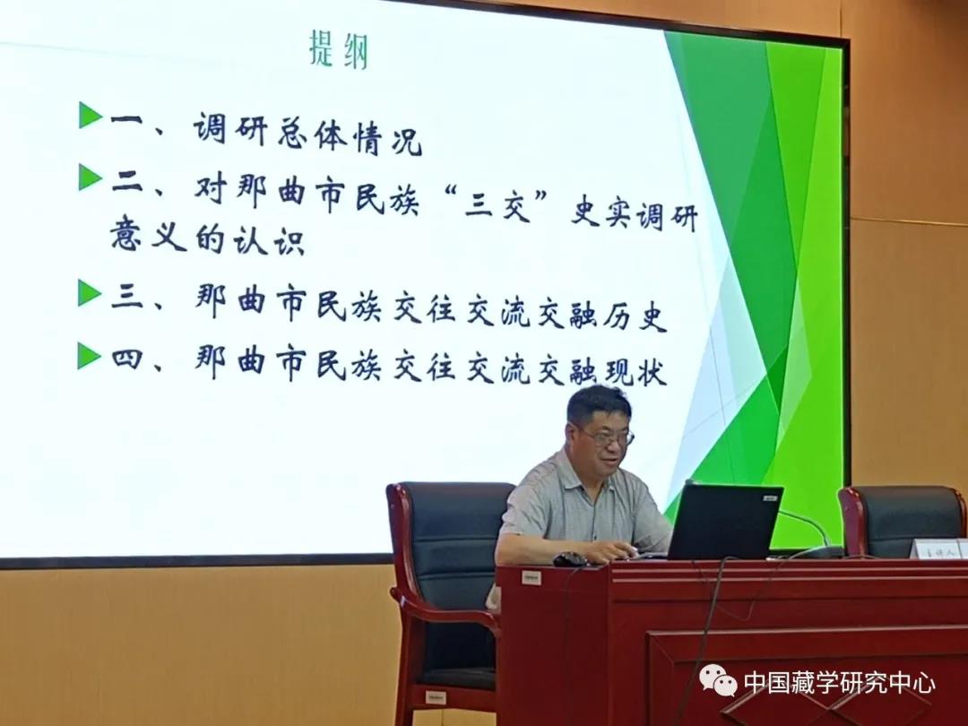 匯報(bào)會(huì)上,馮智研究員介紹了此次調(diào)研的總體情況,談了對(duì)開展各民族交往交流交融史實(shí)進(jìn)行研究的重要意義的認(rèn)識(shí),系統(tǒng)梳理了西藏那曲市各民族交往交流交融的歷史與現(xiàn)狀、趨勢(shì)與特點(diǎn),展示了調(diào)研組挖掘、整理的珍貴歷史檔案資料,充分說(shuō)明了各民族交往交流交融是中華民族的本質(zhì)特征,是推動(dòng)形成中華民族多元一體格局的必然結(jié)果。自遠(yuǎn)古以來(lái),生活在青藏高原的藏族和其他民族的祖先,就與祖國(guó)內(nèi)地建立了廣泛的聯(lián)系,為中華民族命運(yùn)共同體的形成與發(fā)展作出了重要貢獻(xiàn)。調(diào)研組認(rèn)為,西藏那曲市民族交往交流交融的歷史文化、紅色資源、名勝古跡等資源豐富,研究?jī)r(jià)值大,具有重要的現(xiàn)實(shí)意義,值得長(zhǎng)期深入研究。