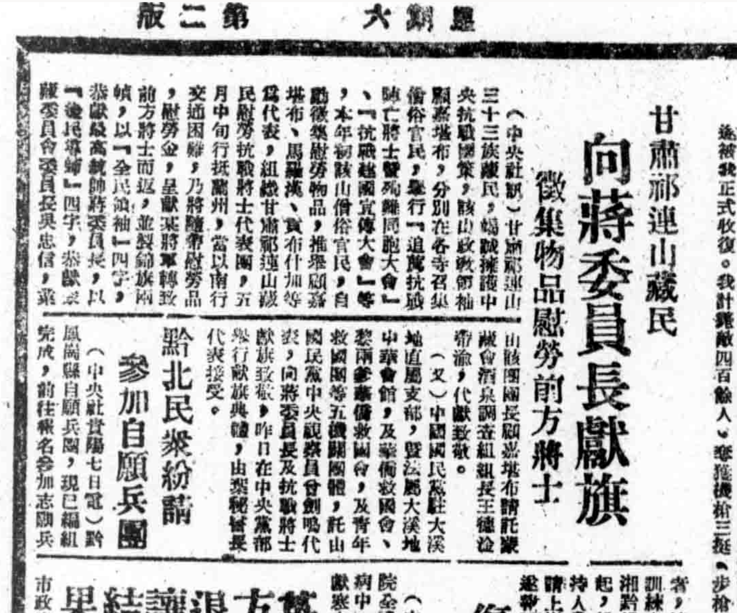 甘肅祁連山藏民向蔣介石獻旗征集物品慰勞前方將士(《新華日報》1939年12月9日)