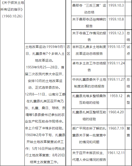 目前,有關西藏民主改革的研究,以宏觀敘事的居多,缺少微觀的細描。大部分的研究著作都是這樣寫的:先是介紹民主改革的方針政策,接著介紹農(nóng)區(qū)的民主改革、牧區(qū)的民主改革、寺廟的民主改革、城鎮(zhèn)和邊境地區(qū)的民主改革,最后總結一下民主改革的意義[2]。引用的都是西藏出臺的各種文件或者當事人的回憶、日記[3],再加一些數(shù)據(jù),基本千篇一律。至于西藏民主改革在農(nóng)區(qū)、牧區(qū)、寺廟和城鎮(zhèn)是如何開展的,一概未見??芍^只見森林,不見樹木。當然這也是相關檔案材料不易查尋的緣故[4]。不過,《扎囊縣民主改革時期檔案整理與研究》的出版恰恰填補了這一空白[5]。該書收錄了扎囊縣有關民主改革的檔案20份,基本展示了扎囊縣民主改革的進程:1959年6月至年底,扎囊縣開展農(nóng)區(qū)“三反雙減”運動(反叛亂、反奴役、反烏拉差役和減租減息)、寺廟“三反三算”運動(反叛亂、反人身奴役、反封建特權,算政治壓迫賬、算等級壓迫賬、算經(jīng)濟剝削賬)和以土地改革為中心的民主改革運動。1960年2月中下旬,開始土地改革復查試點工作,8月20日結束土改復查工作。