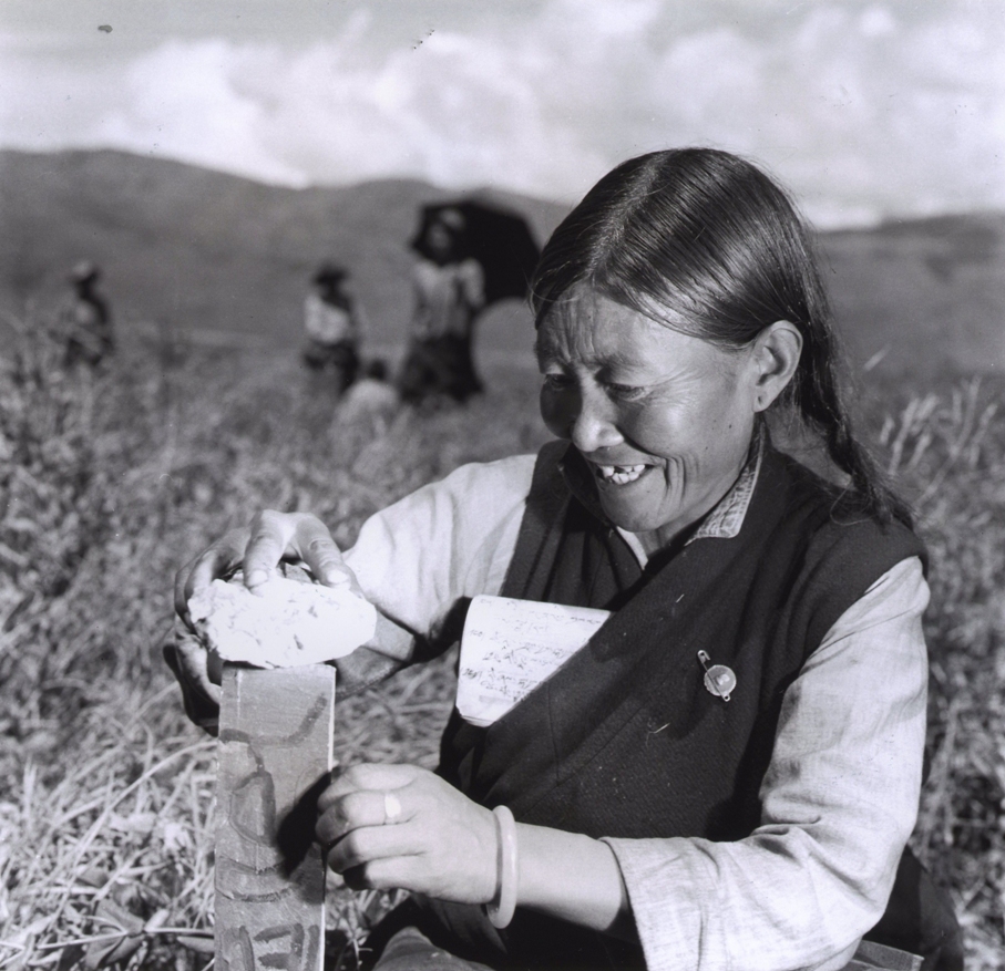 拉加里縣拉加里鄉(xiāng)的農(nóng)協(xié)會(huì)副主任委員洛桑卓瑪,在新分到的土地上釘標(biāo)記。