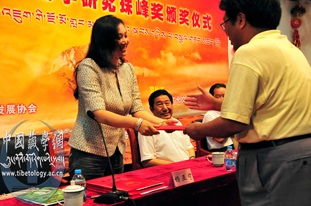 捐贈方代表楊亞寧為第二屆中國藏學(xué)研究珠峰獎獲獎?wù)哳C發(fā)獲獎證書