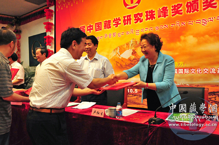 中國國際文化交流基金會理事盧紅生為第二屆中國藏學(xué)研究珠峰獎獲獎?wù)哳C發(fā)獲獎證書