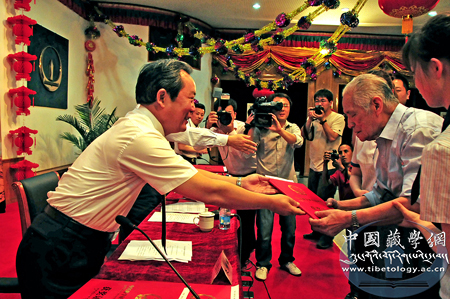 統(tǒng)戰(zhàn)部常務(wù)副部長(zhǎng)朱維群為第二屆中國藏學(xué)研究珠峰獎(jiǎng)榮譽(yù)獎(jiǎng)獲獎(jiǎng)?wù)叽眍C發(fā)證書