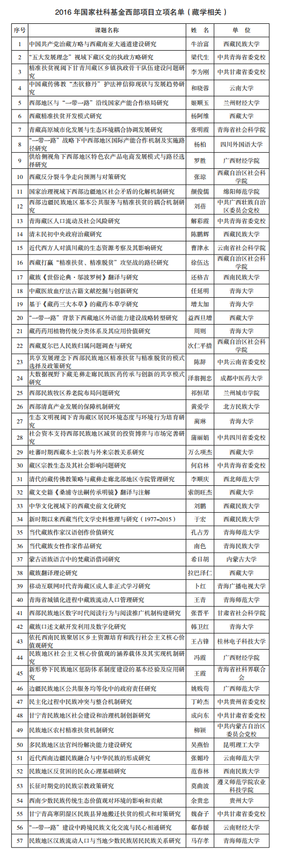 經(jīng)專家評審、社會公示并報全國哲學(xué)社會科學(xué)規(guī)劃領(lǐng)導(dǎo)小組批準(zhǔn),6月 17日由全國哲學(xué)社會科學(xué)規(guī)劃辦公室將 2016年度國家社科基金西部項目評審立項結(jié)果予以公布。今年西部項目共立項 480項,其中涉及藏學(xué)相關(guān)項目 57項。