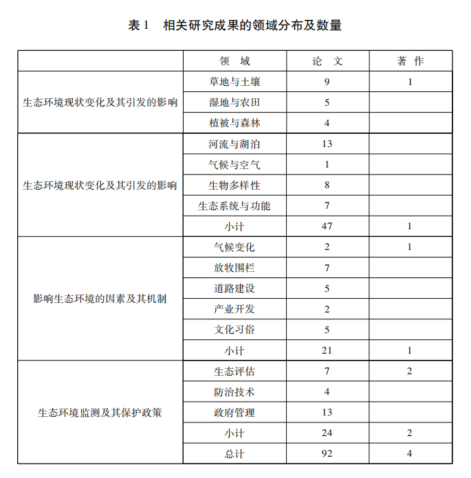 生態(tài)環(huán)境保護(hù)研究成果主要分布于三個領(lǐng)域:生態(tài)環(huán)境現(xiàn)狀變化及其引發(fā)的影響、影響生態(tài)環(huán)境的因素及其機(jī)制、生態(tài)環(huán)境的評估及保護(hù)政策。2017年生態(tài)環(huán)境現(xiàn)狀變化及引發(fā)的影響研究主要集中在草地土壤、濕地農(nóng)田、植被森林、河流湖泊、氣候空氣、生物多樣性和生態(tài)系統(tǒng)功能等領(lǐng)域。影響生態(tài)環(huán)境的因素及其機(jī)制研究主要集中在氣候變化、放牧圍欄、道路建設(shè)、產(chǎn)業(yè)發(fā)展和文化習(xí)俗等方面。生態(tài)環(huán)境監(jiān)測及保護(hù)政策研究則主要集中在生態(tài)評估、防治技術(shù)和政府管理等領(lǐng)域。