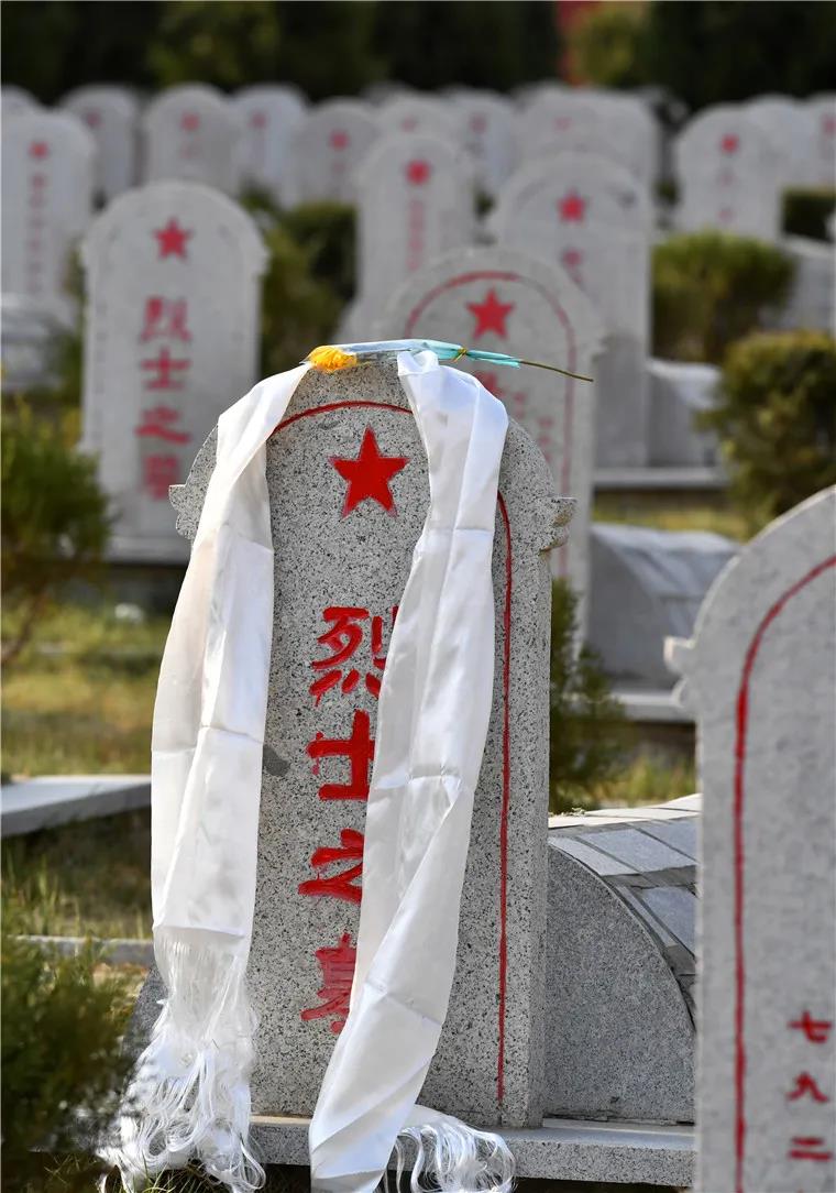 在西藏拉薩烈士陵園,一條潔白的哈達(dá)掛在烈士墓碑上(4月4日攝)。