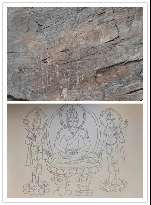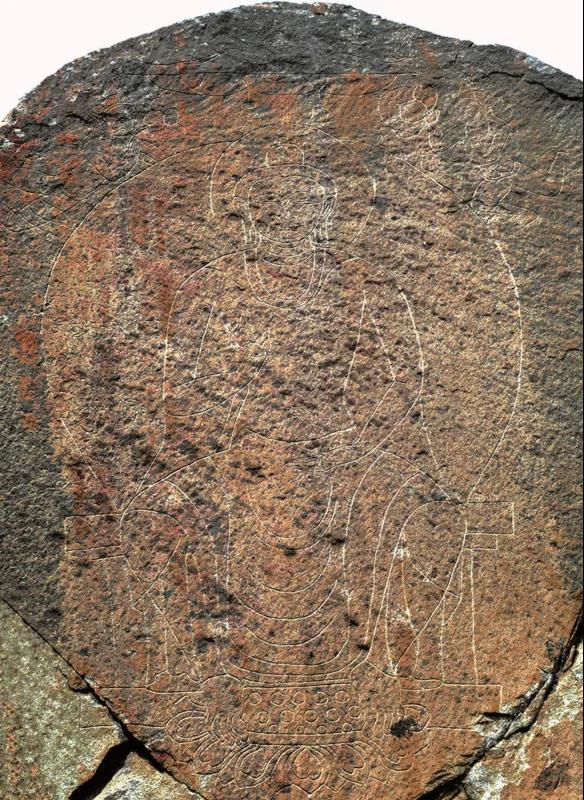 四川石渠照阿拉姆石刻位于四川省甘孜州石渠縣洛須鎮(zhèn)。石刻高約3.5m,內(nèi)容為陰刻大日如來和二菩薩造像圖,主尊大日如來結(jié)跏趺坐,坐于仰蓮寶坐上,手勢為說法和禪定印,左右二側(cè)有二菩薩立像,造像風格屬波羅藝術(shù)風格。左側(cè)和下半部分有古藏文石刻題記,記載了吐蕃贊普赤松德贊功績,題記中還有“楊二”等漢族工匠名字,反映了漢藏工匠共同雕刻此造像的歷史。