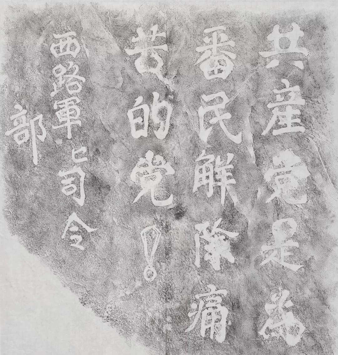 黑水縣沙石多鄉(xiāng)紅軍標語位于四川黑水縣沙石多鄉(xiāng),刻于1935年。1935年7月至1936年8月,紅一、四方面軍先后三次駐扎或經(jīng)過四川,黑水(今四川省阿壩藏族羌族自治州黑水縣)藏族群眾曾幫助紅軍熬鹽、籌糧、籌措物資,拓片中赫然醒目的標語見證了這一段歷史。