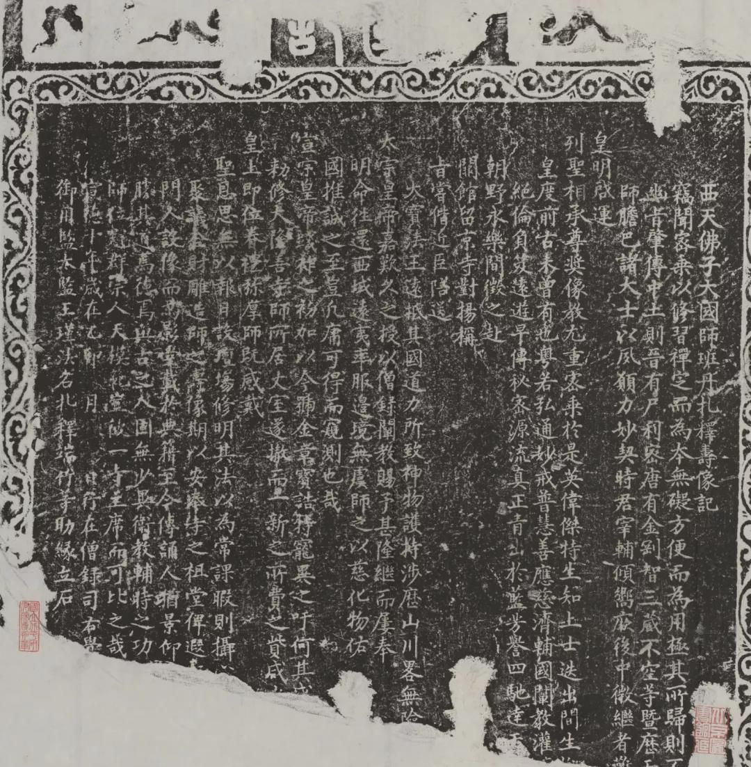 班丹扎釋壽像碑原立于北京市西城區(qū)護國寺內(nèi),明宣德十年(公元 1435年)刻立。碑寬58cm,高61cm,銘刻下半部分殘損。碑文主要記載了班丹扎釋一生功績。大智法王班丹扎釋(????????????????)是明代所封的第四位法王,長期駐京并主持刊修漢藏佛教典籍、建寺、弘法,多次往返京城與西藏之間,為促進漢藏民族交流和明朝對西藏的有效管理做出了巨大貢獻。該碑見證了藏傳佛教高僧大德千里迢迢赴京朝覲,加強與中央政府關(guān)系,擁護明中央政府的重要史實。