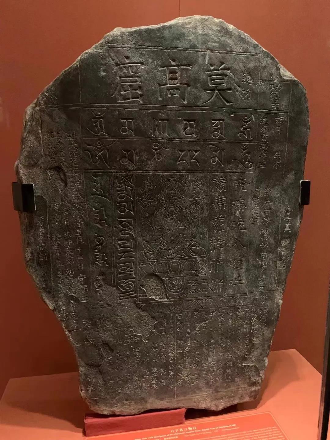 莫高窟造像碑位于甘肅敦煌莫高窟,刻立于元至正八年(公元1348年)。碑中間刻有四臂觀音像,兩邊用漢文、藏文、八思巴文等多種文字刻寫佛教六字真言,功德主名字等歷史信息。該碑是我國各民族交往交流交融的見證。