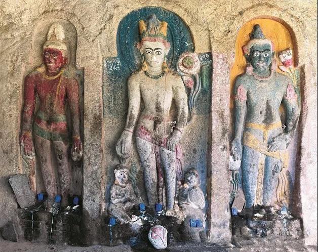 吉隆縣日松貢布石刻位于西藏日喀則市吉隆縣吉隆鎮(zhèn)沖堆村。石刻為三尊立佛,當?shù)乩习傩辗Q為“日松貢布”,即文殊、金剛持、觀音三尊菩薩。從造像風格看屬吐蕃時期造像,可以看出,其受到了尼泊爾等南亞佛教造像藝術(shù)的影響。