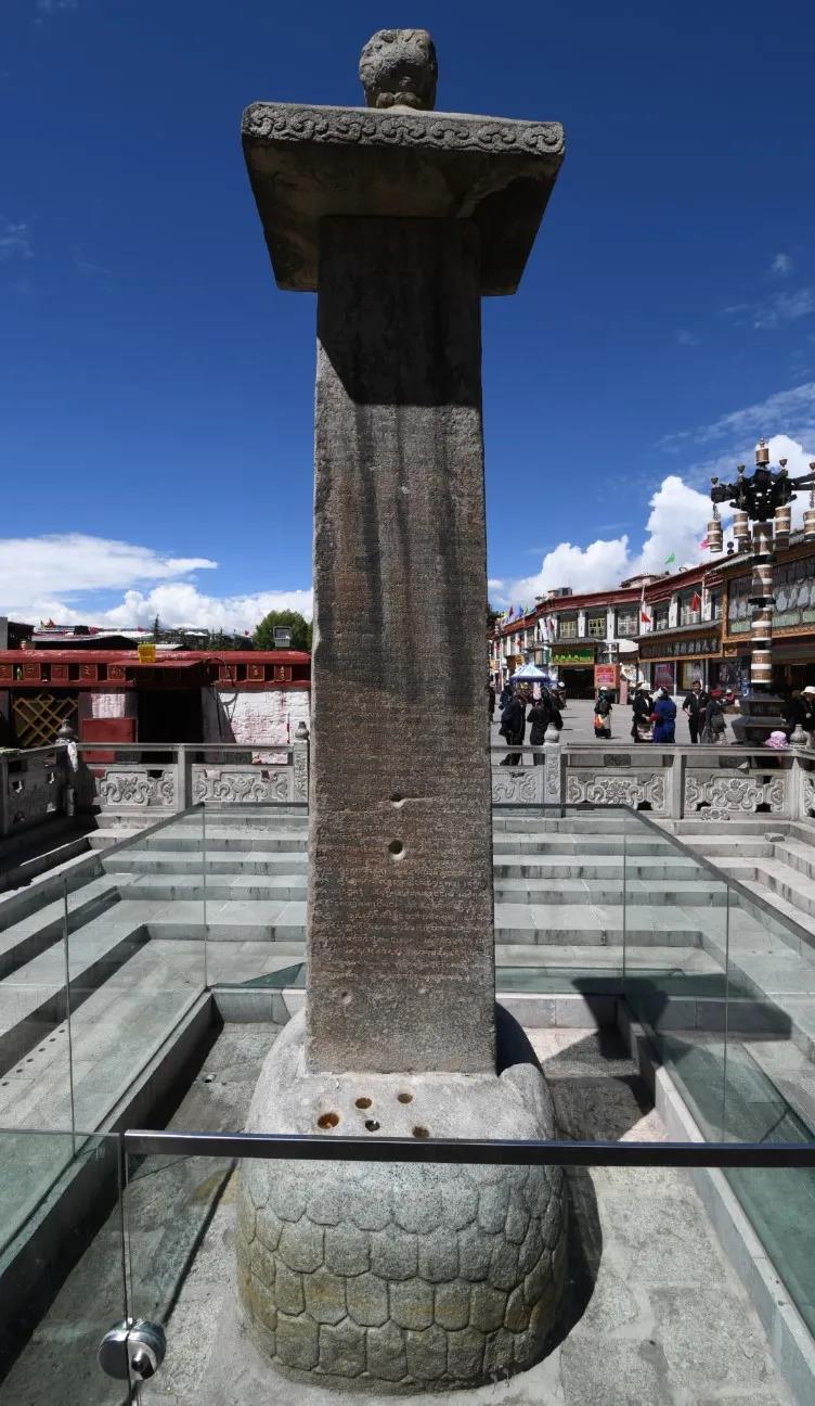 唐蕃會盟碑位于西藏自治區(qū)拉薩市大昭寺前。立于公元823年,吐蕃贊普赤德祖贊時期。碑通高 5.6m,由碑座、碑身和碑首三部分組成,碑座為龜趺座。石碑四面均有銘刻,其中正面為盟辭,以漢藏兩體對照刻寫,其文義相同;左半藏文橫書,字跡蒼古,為古藏文;右半漢文直書,字體為正楷。碑兩側(cè)為參加會盟的雙方官員姓名及品級,背面為藏文盟辭。碑文忠實記錄了唐朝與吐蕃政權(quán)以舅甥情誼,會盟立誓、信守和好、合社稷為一家的內(nèi)容。