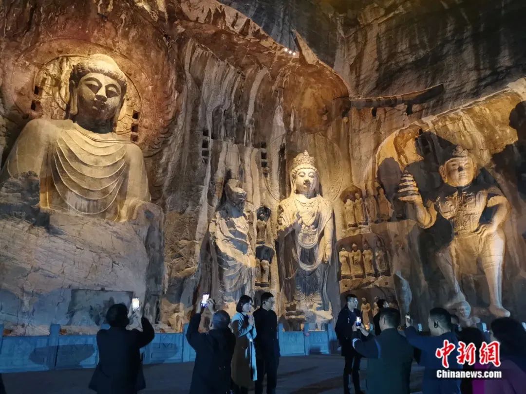 (唐代佛教造像——洛陽龍門石窟盧舍那大佛(左一),是典型的東方面孔。中新社記者劉鵬攝)
