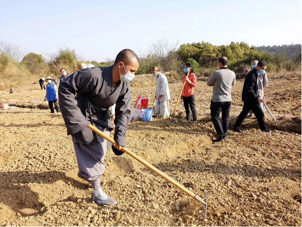 ▲中國佛教參照吸收儒道“自耕自食”的經(jīng)濟(jì)倫理思想,開創(chuàng)“一日不作、一日不食”的“農(nóng)禪并重”制度。圖為湖北武漢靈泉寺僧人和信眾在寺院的農(nóng)禪園里辛勤耕作。湖北省佛教協(xié)會供圖