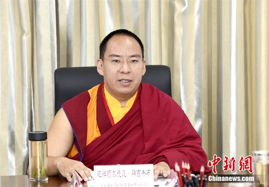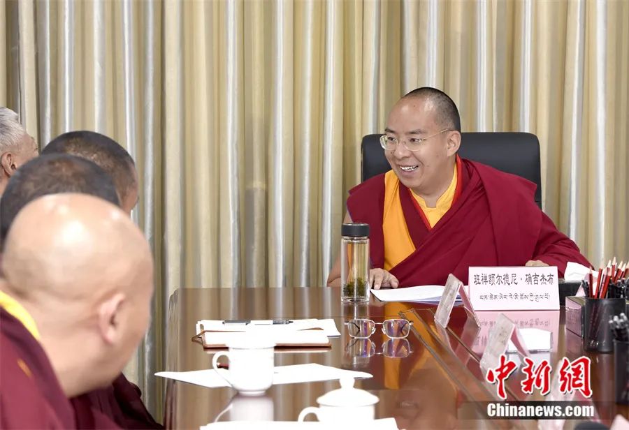 6月2日,班禪與藏傳佛教格魯派高僧座談中發(fā)言。中新社發(fā)李林攝