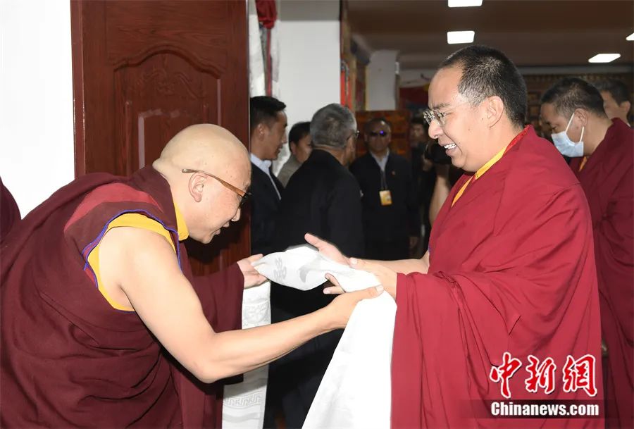 6月2日,班禪與藏傳佛教噶舉派高僧座談前,噶舉派高僧向班禪(圖右)敬獻哈達。中新社發(fā)李林攝