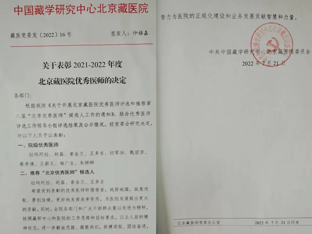 仲格嘉轉(zhuǎn)達(dá)了藏研中心黨組領(lǐng)導(dǎo)的節(jié)日問候和祝賀,并代表醫(yī)院黨委向受到表彰的優(yōu)秀醫(yī)師、優(yōu)秀護(hù)士表示祝賀,向醫(yī)院全體醫(yī)師致以節(jié)日問候。他表示,要時(shí)刻銘記“傳承民族醫(yī)學(xué)、服務(wù)人民健康”的初心和使命,秉承“繼承、創(chuàng)新、和諧、精誠”的精神,把握機(jī)遇,乘勢(shì)而上,順勢(shì)而為,以朝氣蓬勃、奮發(fā)向上的精神風(fēng)貌,塑造一支醫(yī)德醫(yī)風(fēng)好、業(yè)務(wù)能力強(qiáng)、工作作風(fēng)正、服務(wù)水平高的專業(yè)人才隊(duì)伍,為推進(jìn)醫(yī)院醫(yī)療事業(yè)高質(zhì)量發(fā)展貢獻(xiàn)力量,以優(yōu)異成績(jī)和實(shí)際行動(dòng)迎接黨的二十大勝利召開!