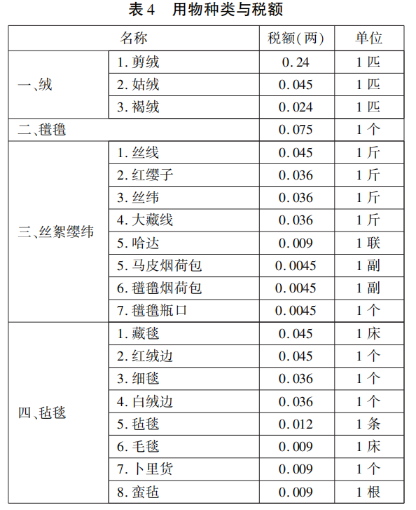 另外,輸出型用物類(lèi)商貨也十分豐富,包括皮張類(lèi)、氆氌、氈毯等(詳見(jiàn)表4)。