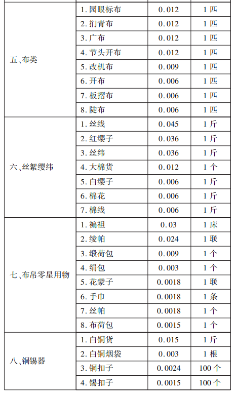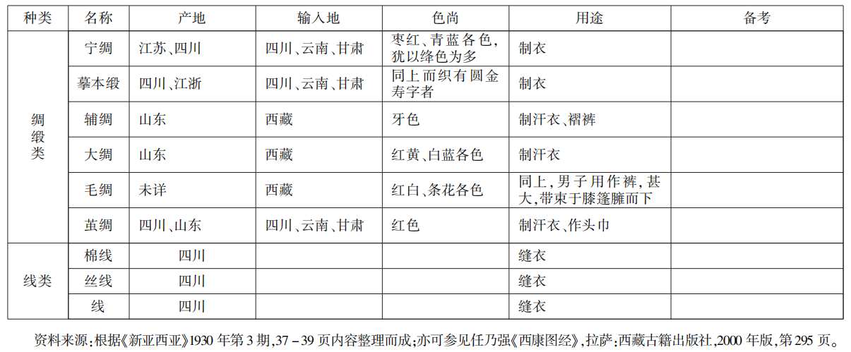 2.用物。從打箭爐用物類(lèi)別來(lái)看,商貨十分豐富,主要包括日常生產(chǎn)生活器具、用具及布帛綢緞(詳見(jiàn)表2)。一部分是作為原材料,與藏地材質(zhì)結(jié)合進(jìn)行再加工使用,如布帛綢緞與皮毛加工成服飾。一部分是制作好的成品運(yùn)往打箭爐銷(xiāo)售。