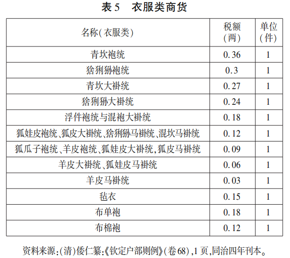 服飾作為人體裝飾的物品總稱,包括衣、帽、鞋、襪等。就清代打箭爐市場(chǎng)流通的服飾及稅則來(lái)看,類(lèi)別多樣,十分豐富(詳見(jiàn)表5)。