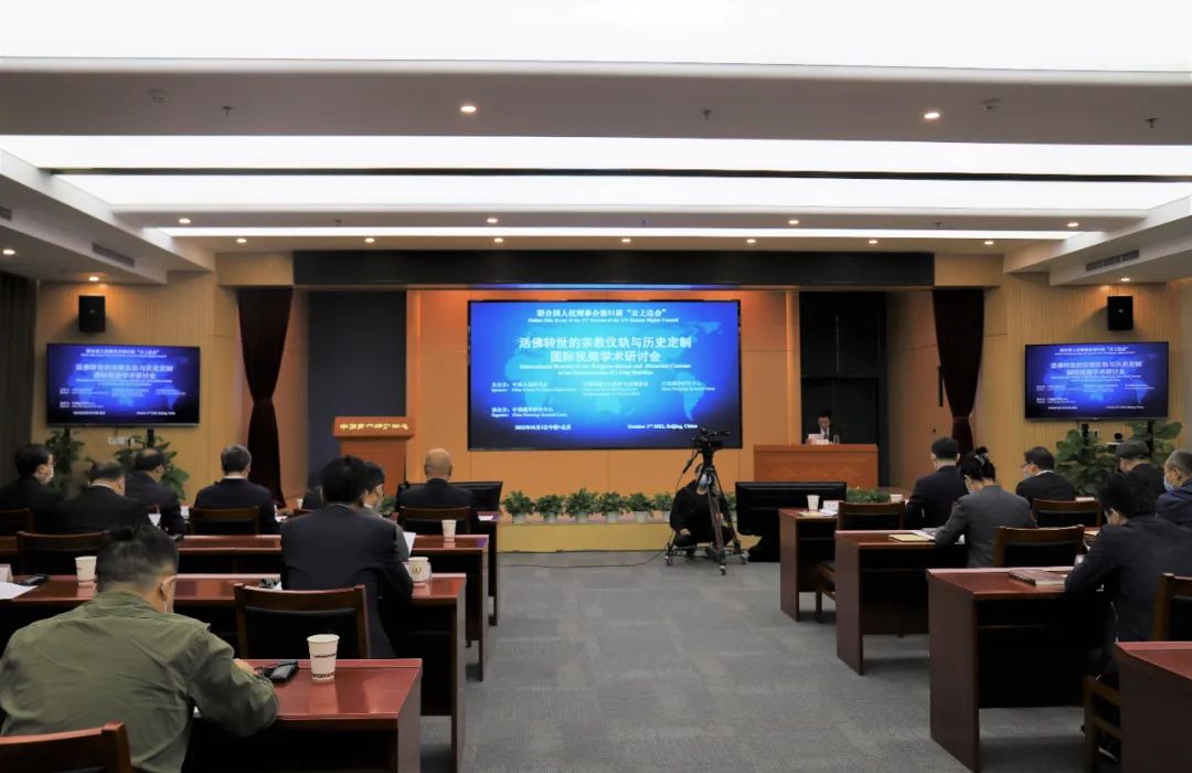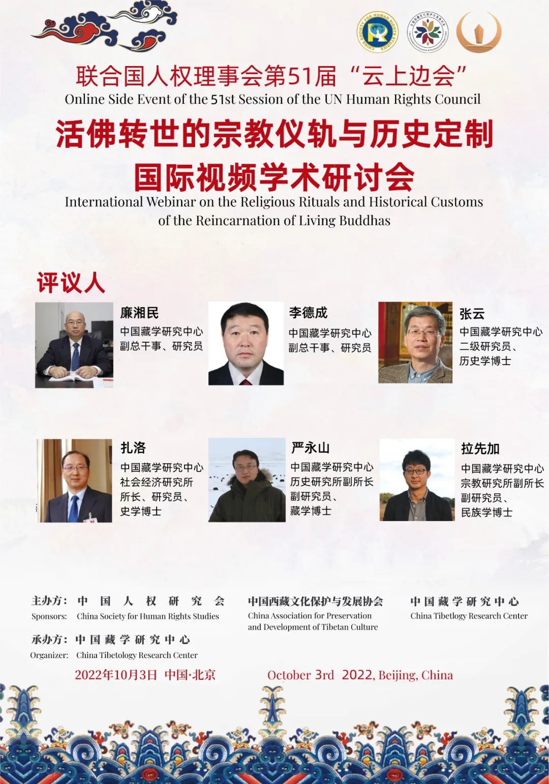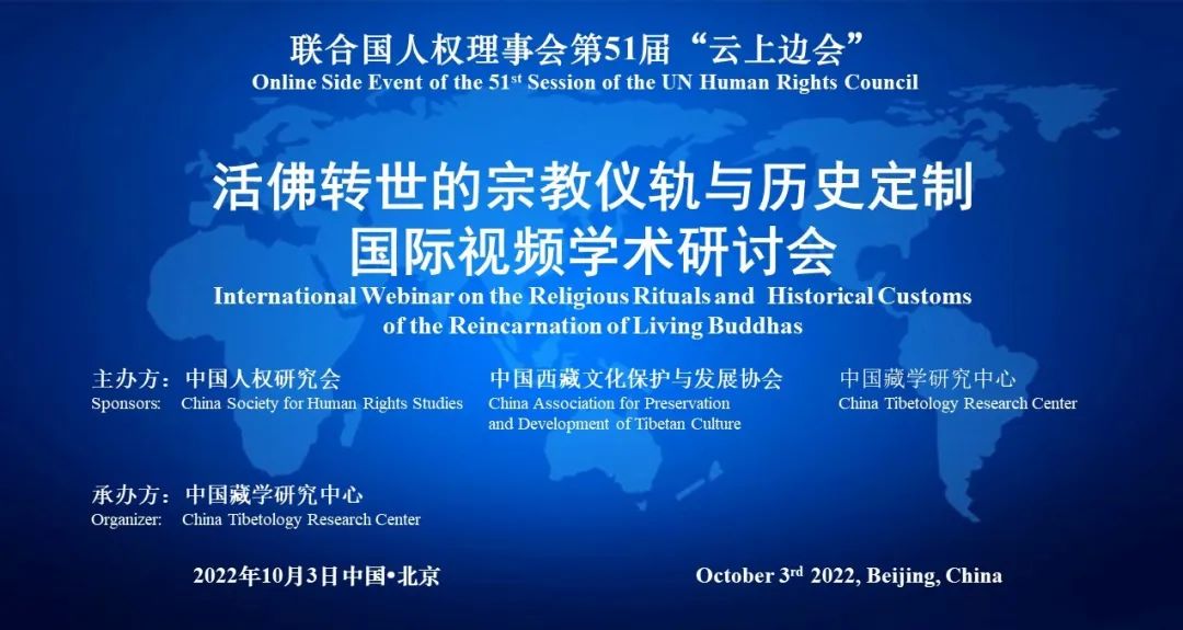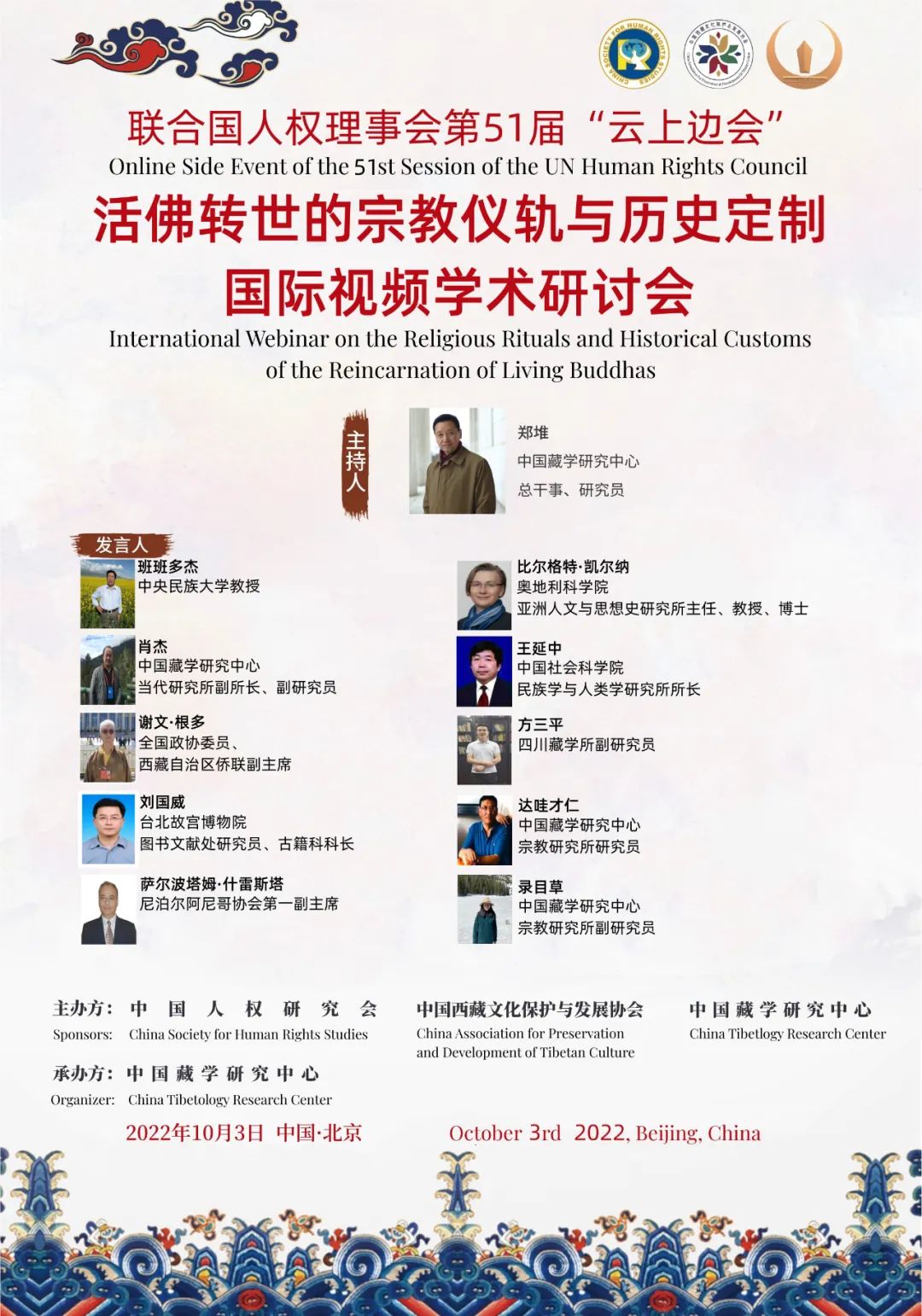 10月3日,聯(lián)合國人權(quán)理事會(huì)第51屆會(huì)議云上邊會(huì)——“活佛轉(zhuǎn)世的宗教儀軌與歷史定制”國際視頻學(xué)術(shù)研討會(huì)在京舉行。會(huì)議由中國人權(quán)研究會(huì)、中國西藏文化保護(hù)與發(fā)展協(xié)會(huì)、中國藏學(xué)研究中心共同主辦,中國藏學(xué)研究中心承辦。中國藏學(xué)研究中心黨組書記、副總干事陳宗榮,中國人權(quán)研究會(huì)秘書長唐獻(xiàn)文、副秘書長王琰文,中國西藏文化保護(hù)與發(fā)展協(xié)會(huì)理事李進(jìn)出席。國內(nèi)外有關(guān)專家學(xué)者30余人以線上線下相結(jié)合的方式參會(huì)。研討會(huì)由中國藏學(xué)研究中心總干事鄭堆主持。