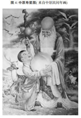 《六長壽圖》是經(jīng)常出現(xiàn)在西藏民居門口的壁畫,具有濃郁的中原文化特色,其象征物源于中原文化(見圖3)。該圖以一位皓發(fā)銀須、面目慈祥的老者為中心,高高的額頭,有著中原文化中壽星仙風(fēng)道骨的質(zhì)感。老者周圍還穿插著車輪、傘蓋、海螺等吉祥八寶,麋鹿和仙鶴嬉戲在林中,山間有曲折隱秘的溪流,呈現(xiàn)出一幅恬靜和美、深邃致遠、融洽無間的仙境圖景,圖中的人、山、河、樹、鳥、獸等造像在藏漢文化中都寓意長壽,從繪畫技法、畫面構(gòu)成、造像特點等方面來看,濃厚的中原文化氣息撲面而來,與《中原壽星圖》(見圖4)有幾分神似。