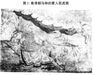《蒙人馭虎圖》(見圖1)藏語稱“梭波達扯”,表現(xiàn)的是一位蒙古人裝束的勇士,用一條鐵鏈牽著一只猛虎的帶有裝飾性的繪畫作品。蒙古勇士、猛虎、鐵鏈分別象征密教三怙主,即觀音菩薩、文殊菩薩、金剛手菩薩。該裝飾畫借助蒙古勇士、猛虎、鐵鏈形象地表達西藏人民祈求三怙主的護佑,祛災(zāi)納福的愿望。該圖常常繪制于院落門口的照壁上,老虎和蒙古勇士必須面朝門外,表示驅(qū)除一切災(zāi)禍、永絕不祥之意。從這位蒙古勇士的裝束來看,此畫源自元代藝術(shù),是藏族文化和蒙古族文化交流的見證。更為有趣的是,筆者在查找資料時,還發(fā)現(xiàn)了身著清朝馬褂的蒙人馭虎圖(見圖2),從表現(xiàn)形式上看,畫在照壁上、頭朝外的做法,類似于中原文化的門神,表達求吉、趨利、祈福、求生、避害等心理訴求,是對生命、財富、安康與祥瑞的祈愿和關(guān)切,表達了對美好生活的追求,是西藏文化與中原文化相交的見證。