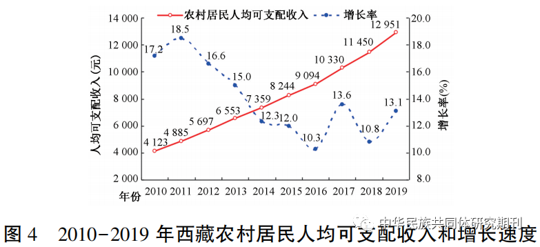 綜上所述,西藏和平解放以來,西藏堅持黨的集中統(tǒng)一領(lǐng)導(dǎo)為脫貧攻堅的勝利提供了根本保障。消除絕對貧困工作的有效開展,是更好地穩(wěn)固中華民族共同體物質(zhì)基礎(chǔ)的生動實踐。數(shù)據(jù)顯示,進入新世紀,西藏農(nóng)牧民人均可支配收入連續(xù)17年保持兩位數(shù)增長并突破萬元大關(guān),2019年達到12951元(見圖4)。