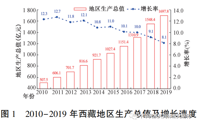 一方面,經(jīng)濟增長為推動中華民族共同體建設(shè)提供物質(zhì)保障。形塑經(jīng)濟-利益共同體建設(shè)是中華民族共同體的重要內(nèi)容之一。通過消除絕對貧困建立經(jīng)濟-利益共同體,成為了西藏建設(shè)中華民族共同體的重要路徑。改革開放后,西藏工作在中央召開的7次西藏工作座談會的指引下,形成了不同時段的工作指導(dǎo)思想,制定了多種特殊優(yōu)惠政策,從資金、人力、技術(shù)等方方面面給予西藏發(fā)展支持,極大解放和發(fā)展了社會生產(chǎn)力,達成了經(jīng)濟-利益共同體的形塑。2010年以來,西藏經(jīng)濟總量持續(xù)增長擴大(見圖1)。
