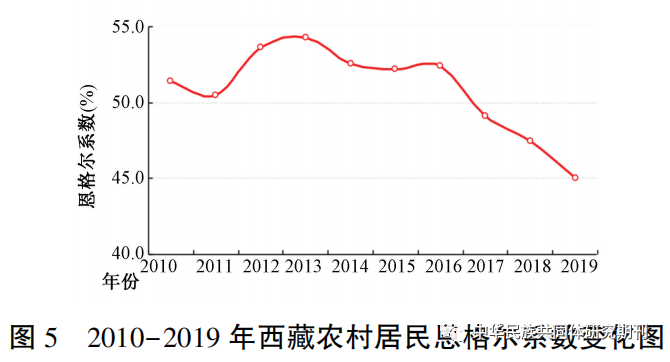 我國憲法規(guī)定:“國家建立健全同經(jīng)濟發(fā)展水平相適應(yīng)的社會保障制度。”循此思路,西藏在經(jīng)濟增長的基礎(chǔ)上,全心全意努力實現(xiàn)社會事業(yè)的全面進步,社會保障制度得以建立健全,絕對貧困得以消除,人民群眾的獲得感和幸福感進一步增強。建設(shè)基礎(chǔ)和公共服務(wù)設(shè)施對于提升貧困地區(qū)的教科文衛(wèi)等有巨大推動作用,近年來西藏農(nóng)村居民恩格爾系數(shù)不斷下降(見圖5),居民的生活條件有了極大的改善,物質(zhì)條件不斷提高,更能使西藏地區(qū)人民群眾擁護和支持中華民族共同體建設(shè)。