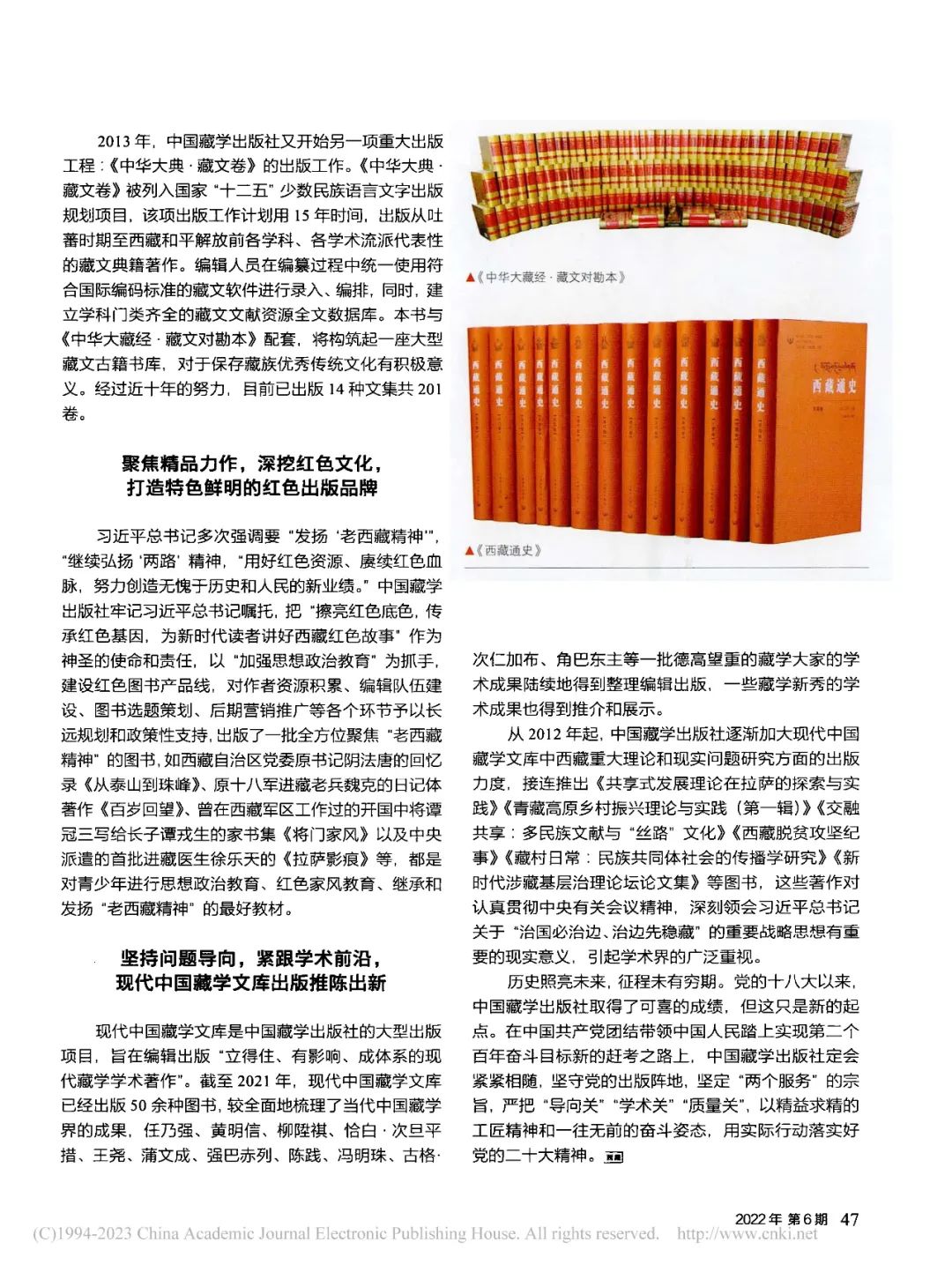歷史照亮未來,征程未有窮期。黨的十八大以來,中國藏學(xué)出版社取得了可喜的成績,但這只是新的起點(diǎn)。在中國共產(chǎn)黨團(tuán)結(jié)帶領(lǐng)中國人民踏上實(shí)現(xiàn)第二個百年奮斗目標(biāo)新的趕考之路上,中國藏學(xué)出版社定會緊緊相隨,堅(jiān)守黨的出版陣地,堅(jiān)定“兩個服務(wù)”的宗旨,嚴(yán)把“導(dǎo)向關(guān)”“學(xué)術(shù)關(guān)”“質(zhì)量關(guān)”,以精益求精的工匠精神和一往無前的奮斗姿態(tài),用實(shí)際行動落實(shí)好黨的二十大精神。