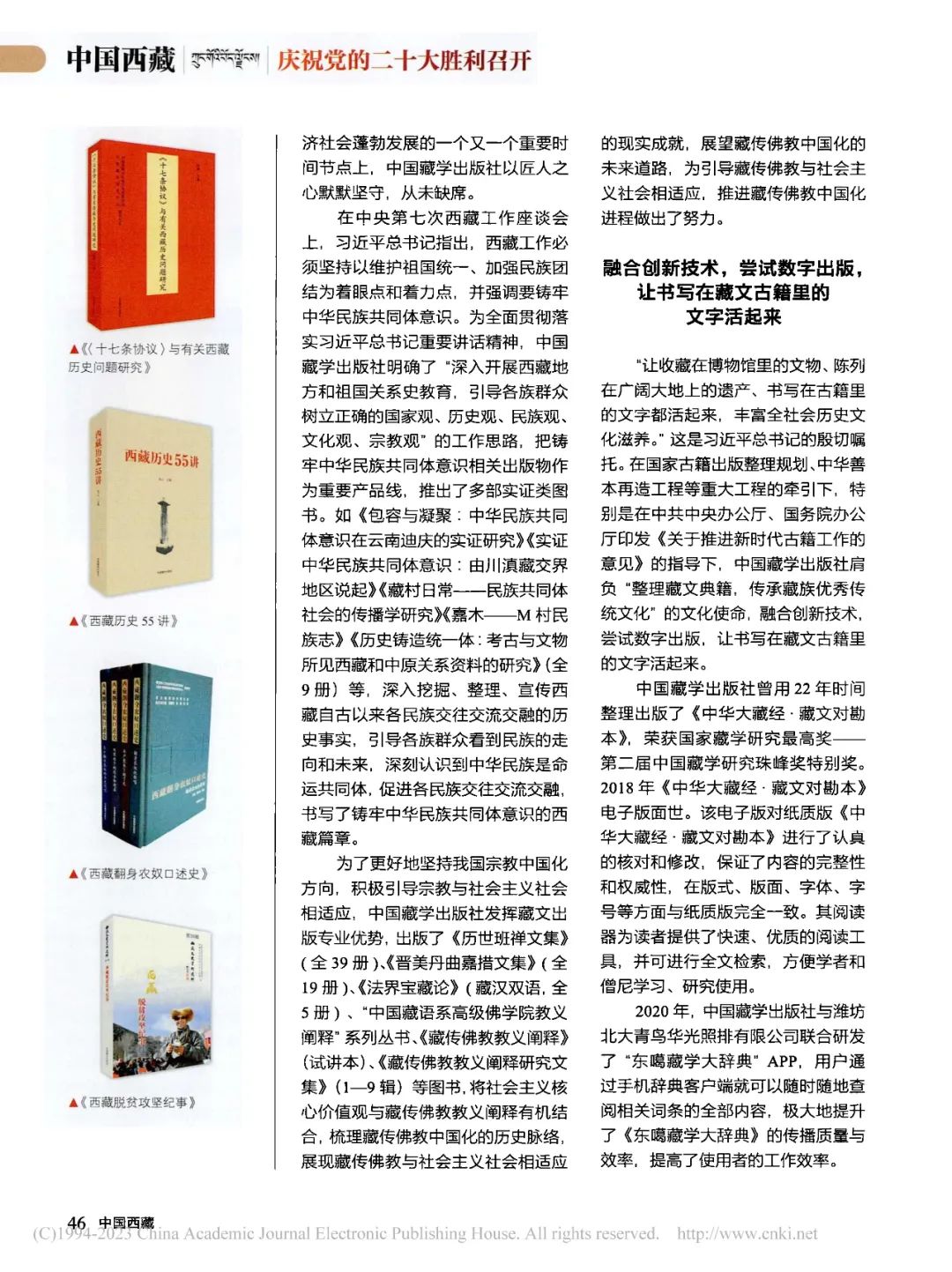 2016年底,國內(nèi)外首部體例完整、內(nèi)容全面、系統(tǒng)展現(xiàn)西藏地方歷史研究成果的通史著作《西藏通史》各卷陸續(xù)出版。全書分8卷13冊,共850余萬字,用扎實(shí)的史料、充分的證據(jù)說明西藏自古以來就是中國領(lǐng)土不可分割的一部分,藏族是中華民族大家庭中的重要成員,西藏傳統(tǒng)文化是中華多元文化的有機(jī)組成部分。2019年推出的“西藏民主改革60年”系列叢書分為經(jīng)濟(jì)卷、政治卷、文化卷、民生卷、生態(tài)環(huán)境卷、宗教卷、文獻(xiàn)資料卷和大事記共8卷,以海量歷史文獻(xiàn)和統(tǒng)計(jì)數(shù)據(jù)為基礎(chǔ),全方位、多視角記錄了西藏民主改革60年來的光輝歷程和偉大成就,具有重要的史料價值和現(xiàn)實(shí)意義。2020年出版的“昌都解放70周年”系列叢書共計(jì)10本,全面回顧了70年來,特別是黨的十八大以來昌都發(fā)生的翻天覆地的變化,認(rèn)真總結(jié)了習(xí)近平總書記治邊穩(wěn)藏重要戰(zhàn)略思想在昌都的成功實(shí)踐經(jīng)驗(yàn)。2021年在策劃推動建黨百年、西藏和平解放70周年主題出版工作中,中國藏學(xué)出版社以“高品位”與“系列化”為宗旨開展圖書選題,推出了《西藏歷史55講》《流淌的吉曲河——學(xué)歷史講拉薩》《〈十七條協(xié)議〉與有關(guān)西藏歷史問題研究》《西藏翻身農(nóng)奴口述史叢書》(全4冊)等一批兼具理論深度和文化溫度,兼顧時代價值與藝術(shù)意蘊(yùn)的精品圖書,在確保政治性和準(zhǔn)確性的同時,注重適應(yīng)現(xiàn)代讀者的生活節(jié)奏與審美情趣,受到讀者們的普遍歡迎。在西藏經(jīng)濟(jì)社會蓬勃發(fā)展的一個又一個重要時間節(jié)點(diǎn)上,中國藏學(xué)出版社以匠人之心默默堅(jiān)守,從未缺席。