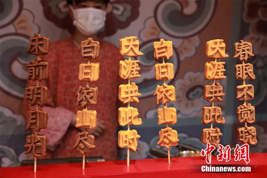 西安大唐不夜城“唐食坊”售賣的唐詩(shī)糕點(diǎn),外形的詩(shī)句文字雕刻精致,具有濃郁的古典文化氣質(zhì)。彭華攝
