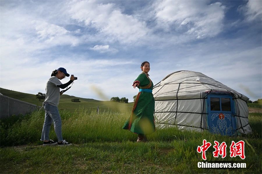 內(nèi)蒙古自治區(qū)錫林郭勒盟,牧民拍攝草原舞蹈短視頻。劉文華攝