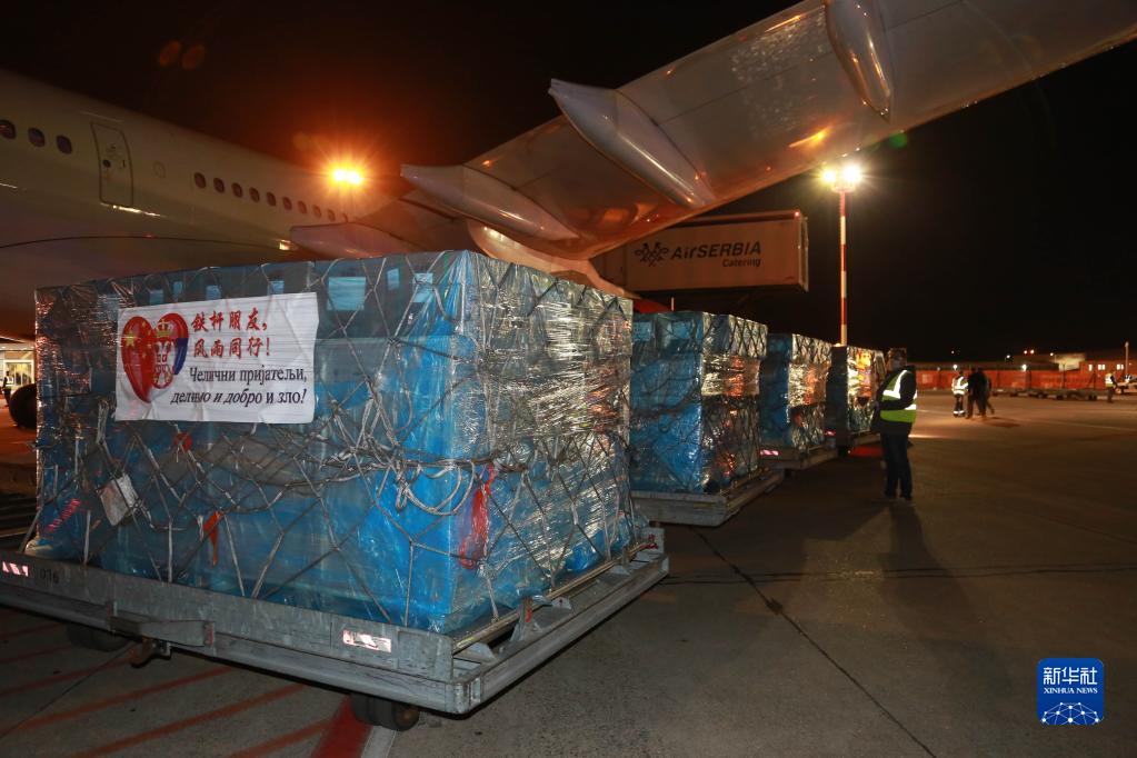 在塞爾維亞首都貝爾格萊德,寫有“鐵桿朋友,風(fēng)雨同行”字樣的中方捐贈(zèng)醫(yī)療物資從飛機(jī)上卸下(2020年3月21日攝)。新華社記者 石中玉 攝