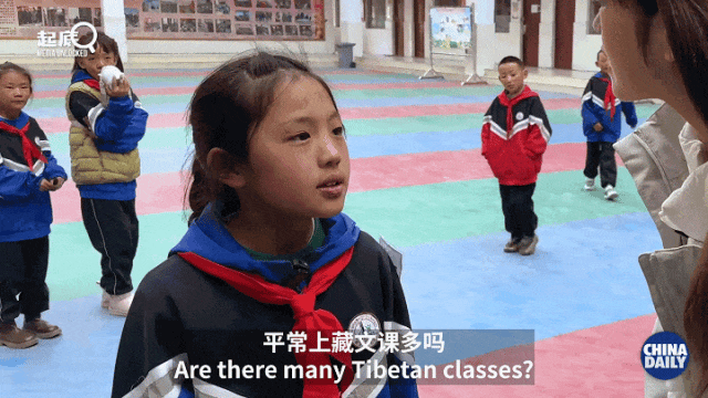 四年級(jí)三班的小學(xué)生白瑪拉姆對(duì)記者說,平時(shí)自己要上科學(xué)課、數(shù)學(xué)課、語(yǔ)文課、藏文課。當(dāng)被問到“平時(shí)藏文課多嗎”,她說,“多”。