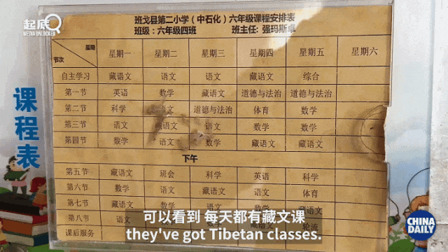 教室門口墻上貼著的課程表上,每日課程安排一目了然:學(xué)生每天都要上藏文課。記者數(shù)了數(shù)還發(fā)現(xiàn),藏文課的數(shù)量要多于普通話課的數(shù)量。