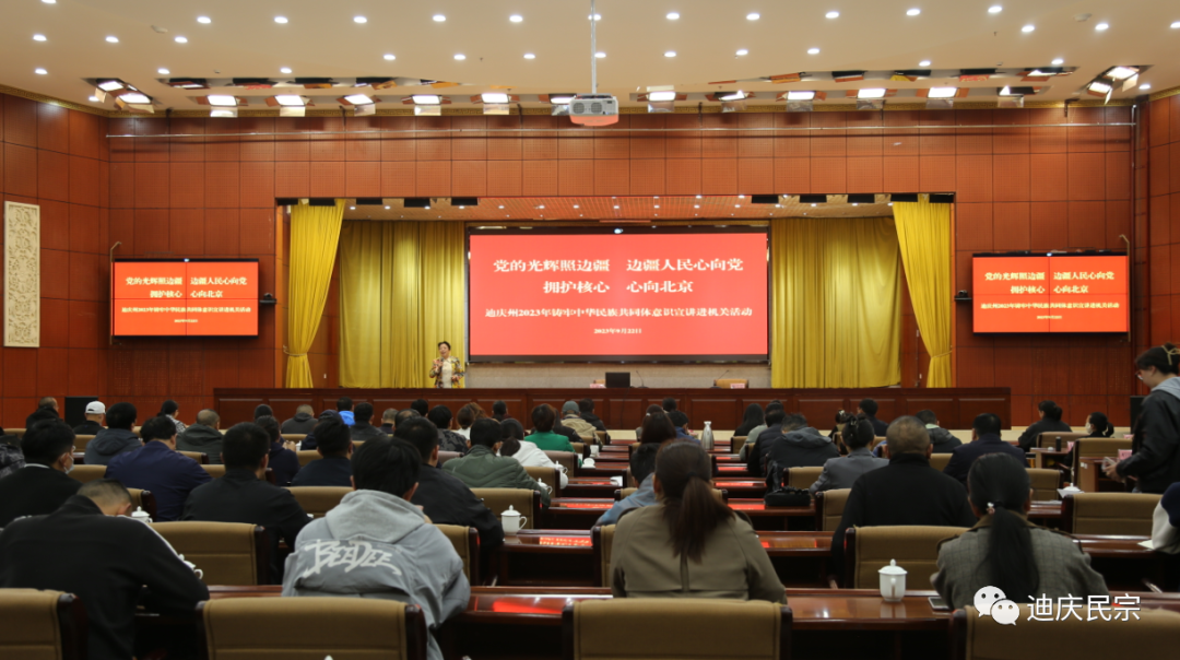 ▲9月22日上午,“黨的光輝照邊疆邊疆人民心向黨擁護核心心向北京”迪慶州2023年鑄牢中華民族共同體意識宣講進機關(guān)活動在州委報告廳舉行