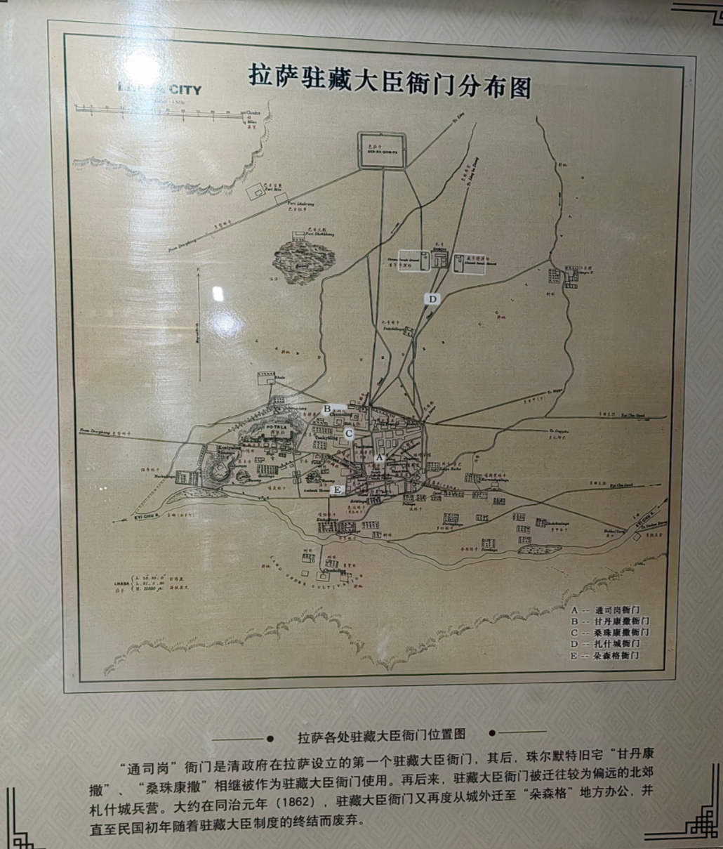陳列館坐落于拉薩大昭寺以北的八廓街北街之上,它原是著名的“八廓街北院”,又是第一處駐藏大臣衙門——沖賽康(通司崗)衙門。駐藏大臣是清朝中央政府派駐西藏地方代行主權(quán)之官員,在雍正五年(1727)至宣統(tǒng)三年(1911)的185年間,共有132位官員赴藏任職。在駐藏大臣的努力下,西藏地方始終處于清朝中央政府的管轄之中,西藏地方的安全、社會秩序的正常運(yùn)轉(zhuǎn)都得到了保障,西藏地方與祖國內(nèi)地之間的交往互動明顯增多加強(qiáng),極大促進(jìn)了民族團(tuán)結(jié)和國家統(tǒng)一,駐藏大臣也因此在清朝中央與地方關(guān)系史上占據(jù)著特別重要的地位。駐藏大臣衙門便是駐藏大臣在藏辦公及居住的場所。實(shí)際上,歷史上曾先后出現(xiàn)過四處駐藏大臣衙門【圖2】,即沖賽康衙門、珠爾默特舊宅改建之衙門(甘丹康薩和桑珠康撒)、札什城衙門和魯布(朵森格)衙門,均造于拉薩城內(nèi)并與軍營相鄰。除沖賽康衙門外,其余三處衙署建筑已不見痕跡,因此,陳列館便選建在沖賽康衙門舊址之上。