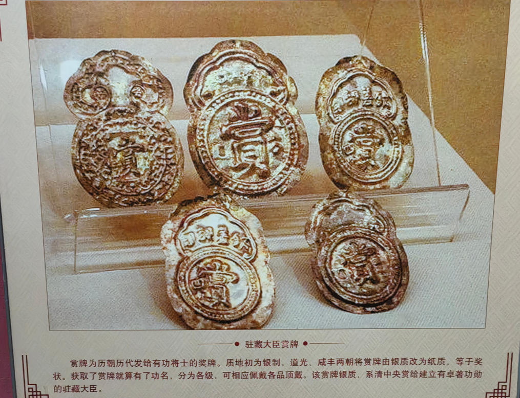 陳列館中還展出了駐藏大臣官服上的“補(bǔ)子”、駐藏大臣乘坐的“官轎”【圖11】、駐藏大臣出行時的“儀仗”、駐藏大臣赴藏上任時被西藏地方官員迎接的“官驛(亭)”【圖12、13】、駐藏大臣的“關(guān)防”、清朝中央政府賜給駐藏大臣的“賞牌”【圖14】以及駐藏大臣向皇帝進(jìn)獻(xiàn)的具有藏族特色的禮物【圖15】等實(shí)物、遺跡圖片。這些細(xì)節(jié)看似無關(guān)緊要,實(shí)際上卻蘊(yùn)含著大量信息。
