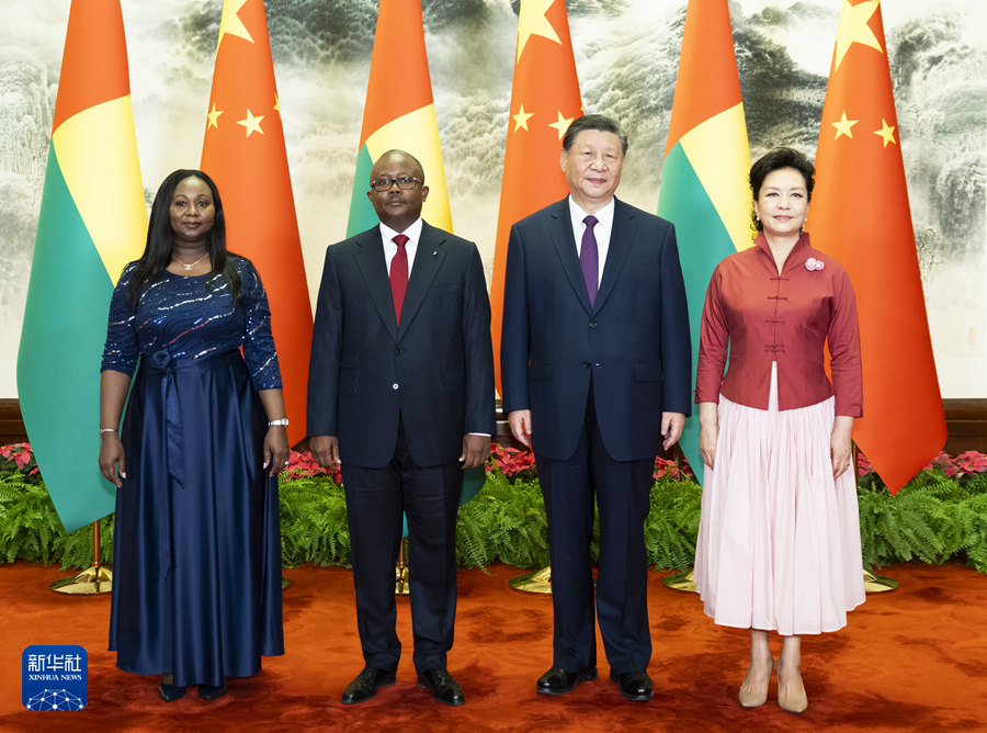 7月10日下午,國家主席習近平在北京人民大會堂同來華進行國事訪問的幾內亞比紹總統恩巴洛舉行會談。這是會談前,習近平和夫人彭麗媛同恩巴洛和夫人迪尼西婭合影。新華社記者黃敬文攝