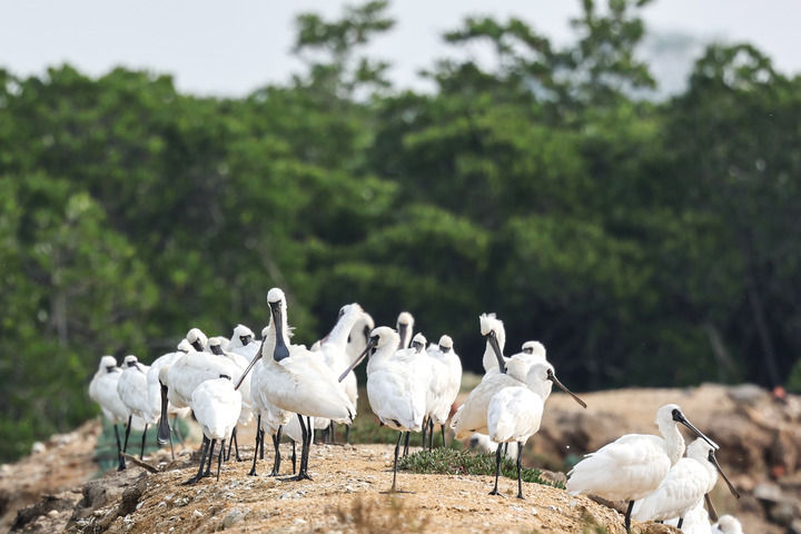 一群黑臉琵鷺在海南新盈紅樹林國家濕地公園休憩(2023年12月27日攝)。新華社記者張麗蕓攝